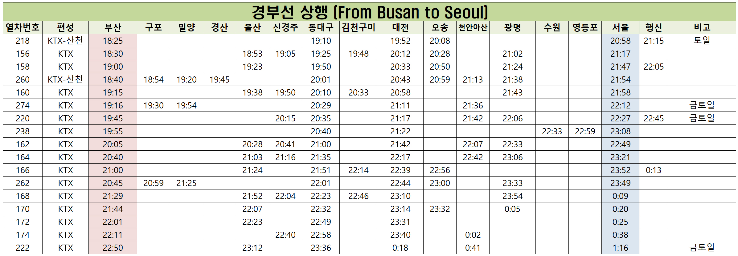 ■ 부산역~서울역 (상행선) 저녁 시간대 (18:00~)