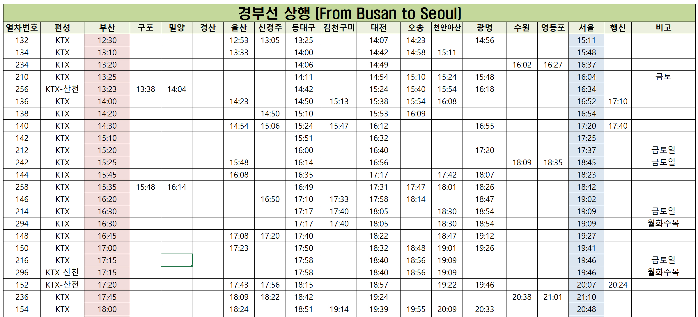 부산역에서 서울역까지 운행하는 상행선 KTX 시간표를 알아 봤으니, 이제 서울역에서 부산역까지 운행하는 하행선 KTX 열차시간표도 한번 살펴보겠습니다.