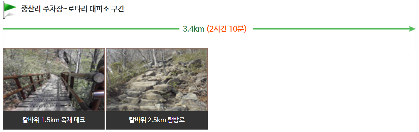 중산리에서 출발하여 칼바위 삼거리부터 장터목 대피소 구간은 암석 및 목재데크가 많고 경사가 심한 구간이어서 체력안배가 필요한 구간입니다.