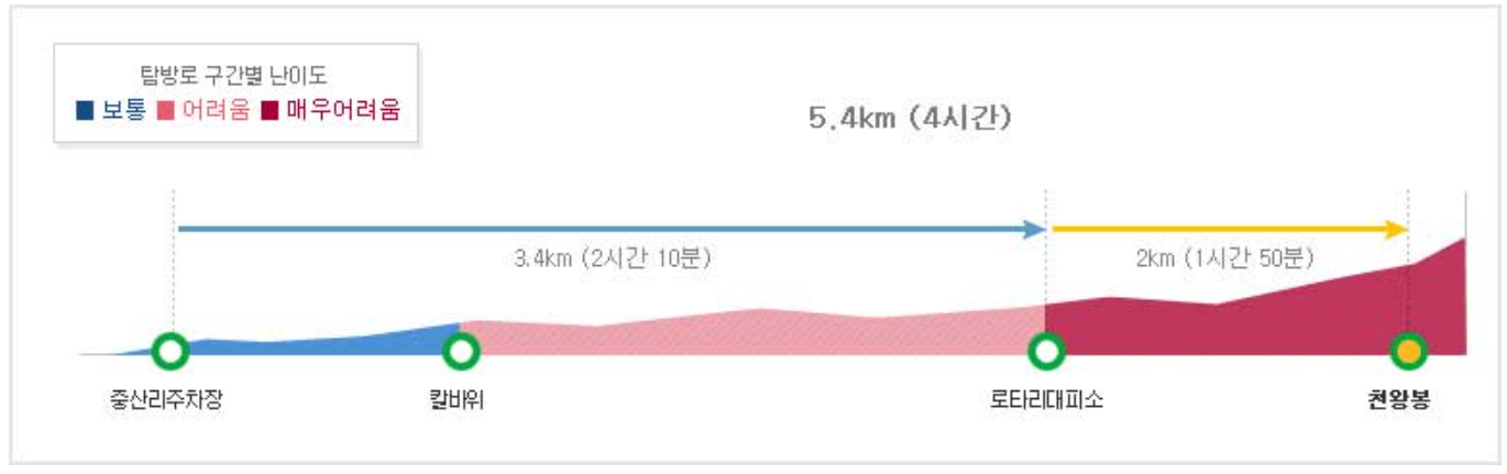 중산리 주차장에서 칼바위 까지는 보통 수준의 난이도로 오른 다음, 칼바위에서부터 로타리 대피소까지는 조금 어려운 상급 코스로 이어지게 됩니다. 아무래도 천왕봉까지 최단코스이다 보니 경사가 급하고 암석이 많은 구간이라 체력안배를 잘하며 올라야 해요.