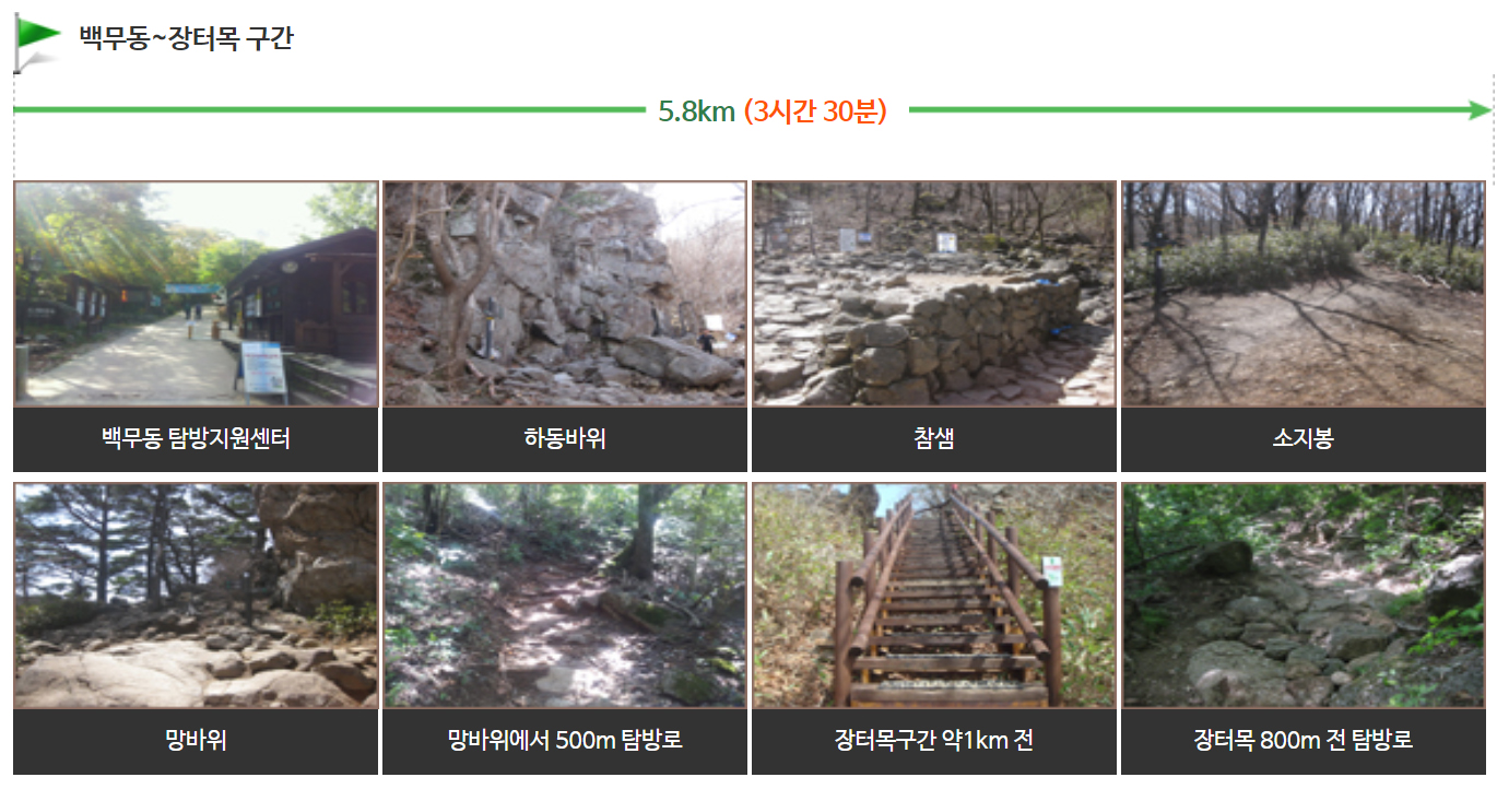 마지막으로 지리산 천왕봉 당일치기로 다녀올 수 있는 코스 중에서 백무동 코스가 있습니다. 백무동 코스는 백무동 탐방지원센터에서부터 시작해 소지봉, 장터목 대피소를 지나 천왕봉까지 이어지는 편도 7.5km, 소요시간 5시간 30분 걸리는 꽤 긴 코스입니다. 왕복으로 하면 15km에 소요시간은 11시간 정도 되는데요. 따라서 당일치기 천왕봉으로 다녀오려면 새벽 일찍부터 출발을 해야 하는 코스입니다. 그래도 동서울~백무동 버스터미널까지 직행으로 운행하는 버스가 있어 서울 및 수도권 등산객들의 교통편이 좋은 편이라 많은 분들이 오르는 코스이기도 합니다.