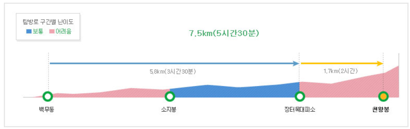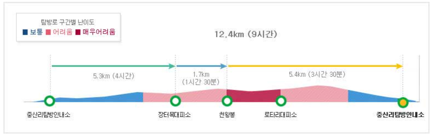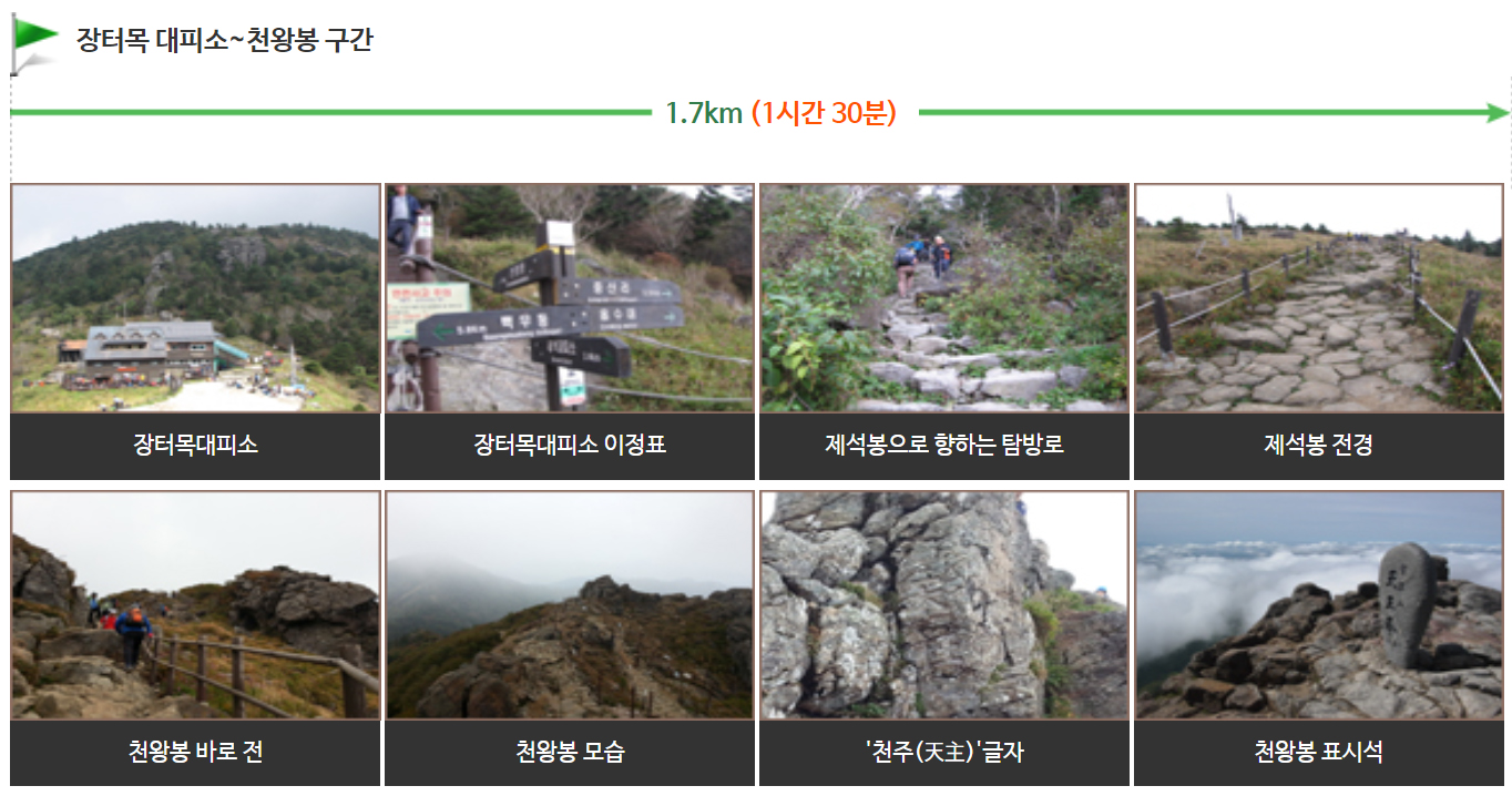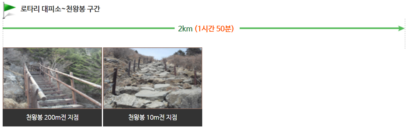 로타리 대피소에서 천왕봉까지의 구간은 더 어려운 최상급 코스로 알려져 있스비다. 천왕샘을 지나 마지막 천왕봉을 오르는 100m 구간은 급경사에 암석으로 된 돌계단이 많아 주의가 필요한 구간이기도 합니다.