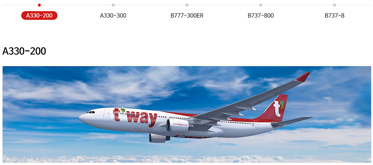 장거리 유럽 노선을 취항하면서부터 티웨이항공의 보유 기종이 매우 다양해졌습니다. 기존 보잉 737-800 기종과 737-8 MAX 기종, 그리고 장거리 및 고수요 노선에 투입되는 A330-200, A330-300이 있고요. 가장 최근에는 보잉 777-300ER까지 도입을 하게 되었습니다.