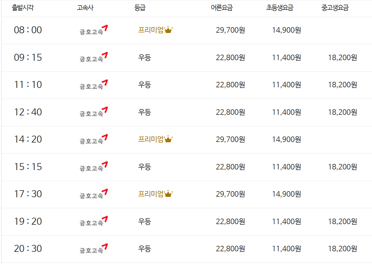 - 우등버스 : 어른 22,800원, 중고생 18,220원, 어린이 11,400원